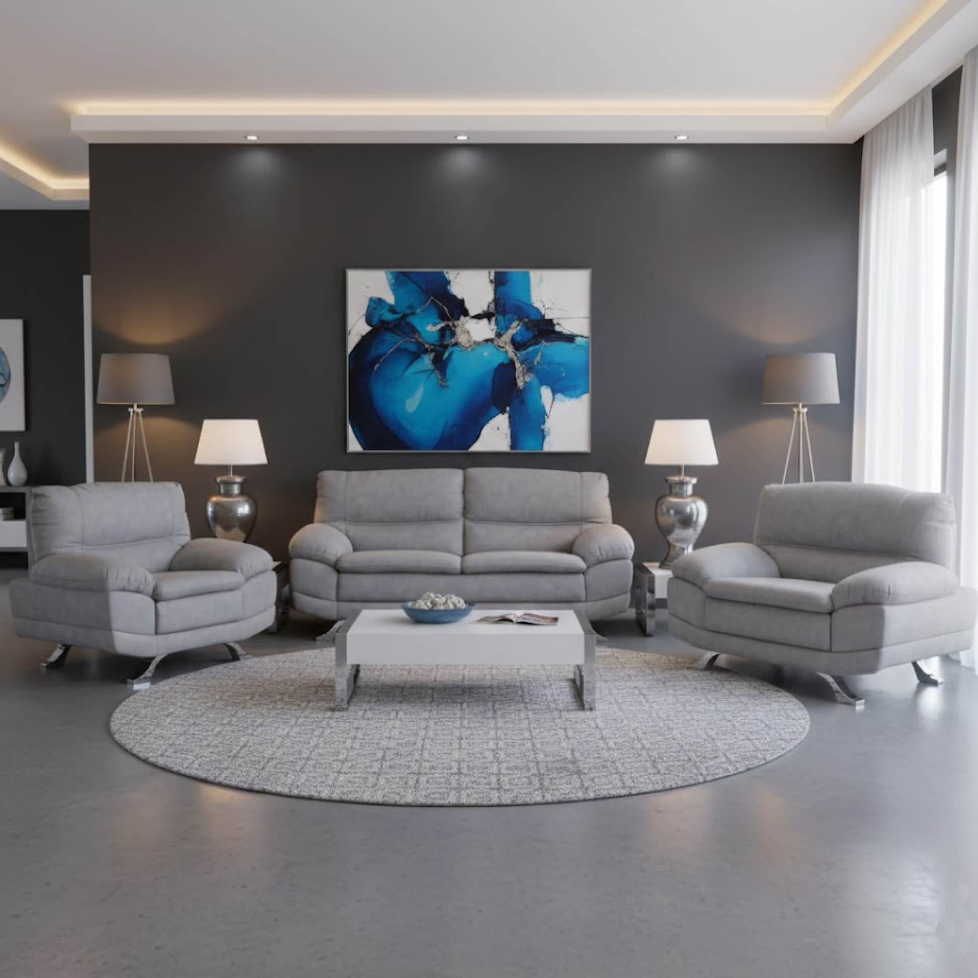 - Design: Large-scale 3.2.1 suite with a modern profile and elegant curved legs